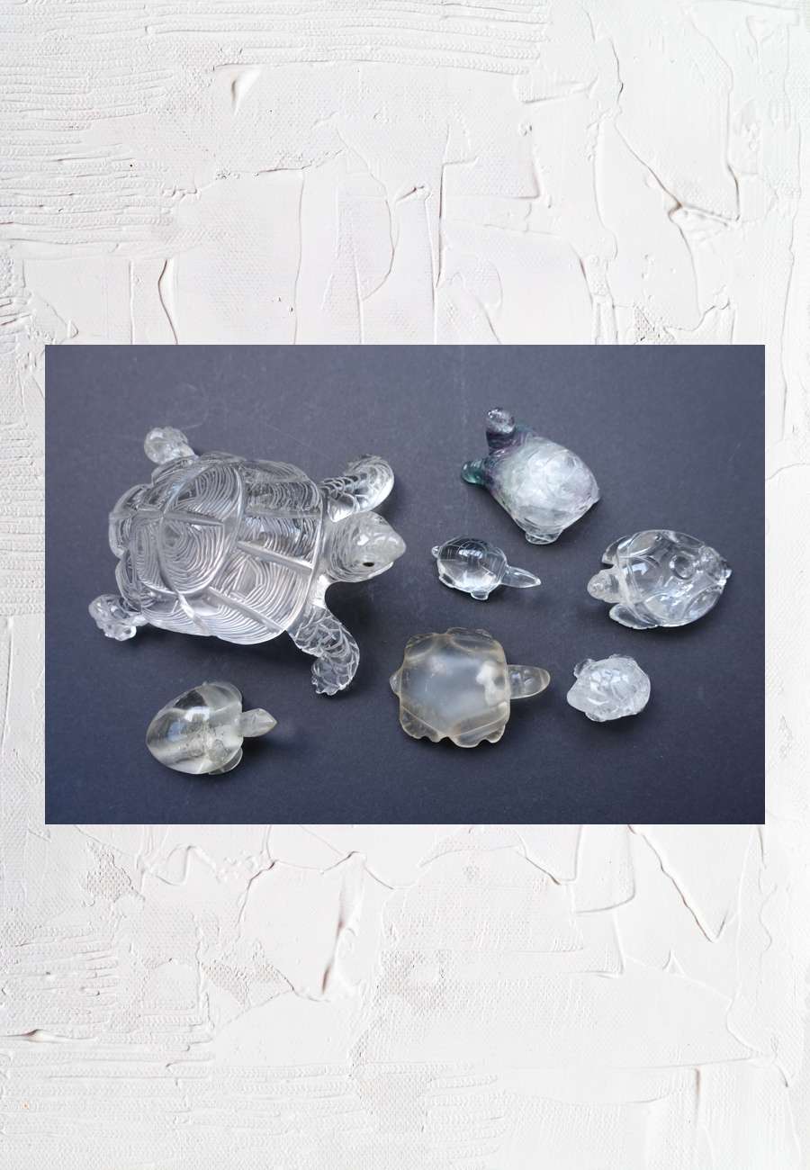 Sieben Bergkristalle (farbloses Quarz), u.a. aus Nepal, Brasilien und der Schweiz. Bergkristalle sind Quarze in ihrer reinsten Form.