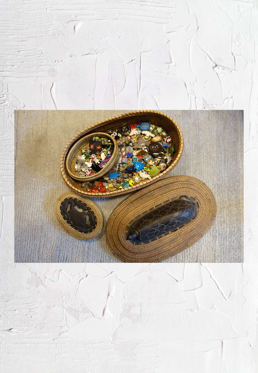 Zwei afrikanische Schmuckkörbe, kunstvoll geflochten, in den Deckel ist jeweils eine Schildkröte aus Tropenholz eingearbeitet, Größe 32 und 15 cm.