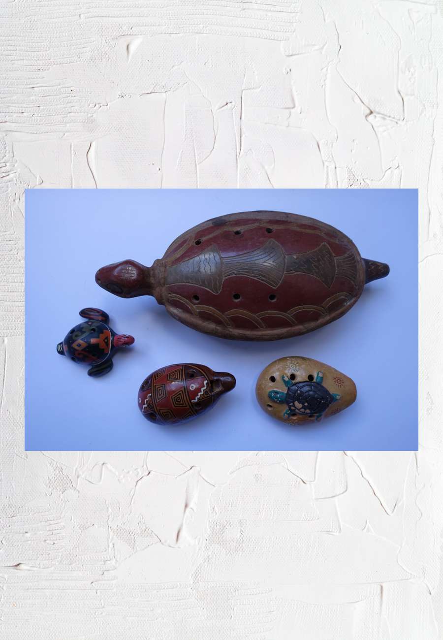 Okarinas (Gefäßflöten) aus Nord- und Südamerika, aus Ton gebrannt und bemalt, überwiegend mit 6 Löchern (und 2 Daumenlöchern an der Unterseite), sie werden am Band um den Hals getragen, Größe 7 - 23 cm. Okarinas sind heute meist ein Souvenir, wurden aber schon von den Mayas, Inkas oder Azteken gespielt.