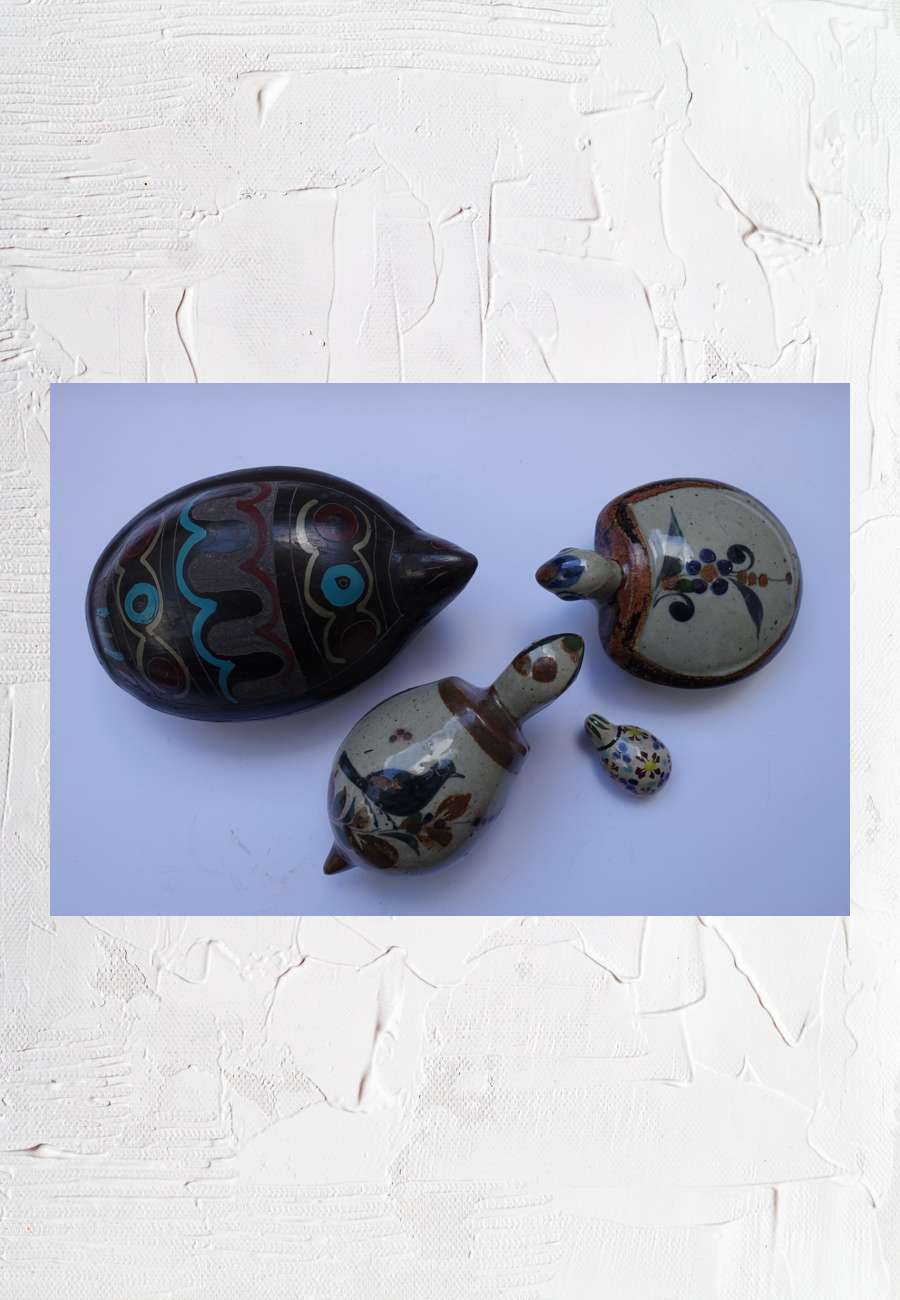 Handgetöpfert und bemalt, Größe 4,7 - 16,5 cm.