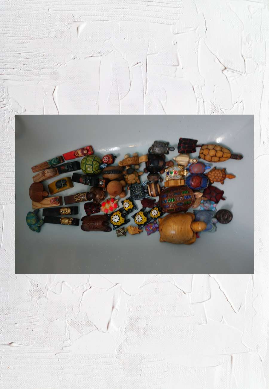 Eine Fülle von Holzarbeiten, u.a. Gebrauchsgegenstände wie Türstopper (links), aus diversen Ländern.