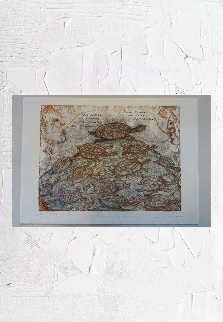 Cartoon, Monotypie und damit ein Unikat, auf Büttenpapier, eigens für mich gefertigt, Titel: "Schildkröten-Wanderung", sign. , Format 35 x 25 cm, rückseitig