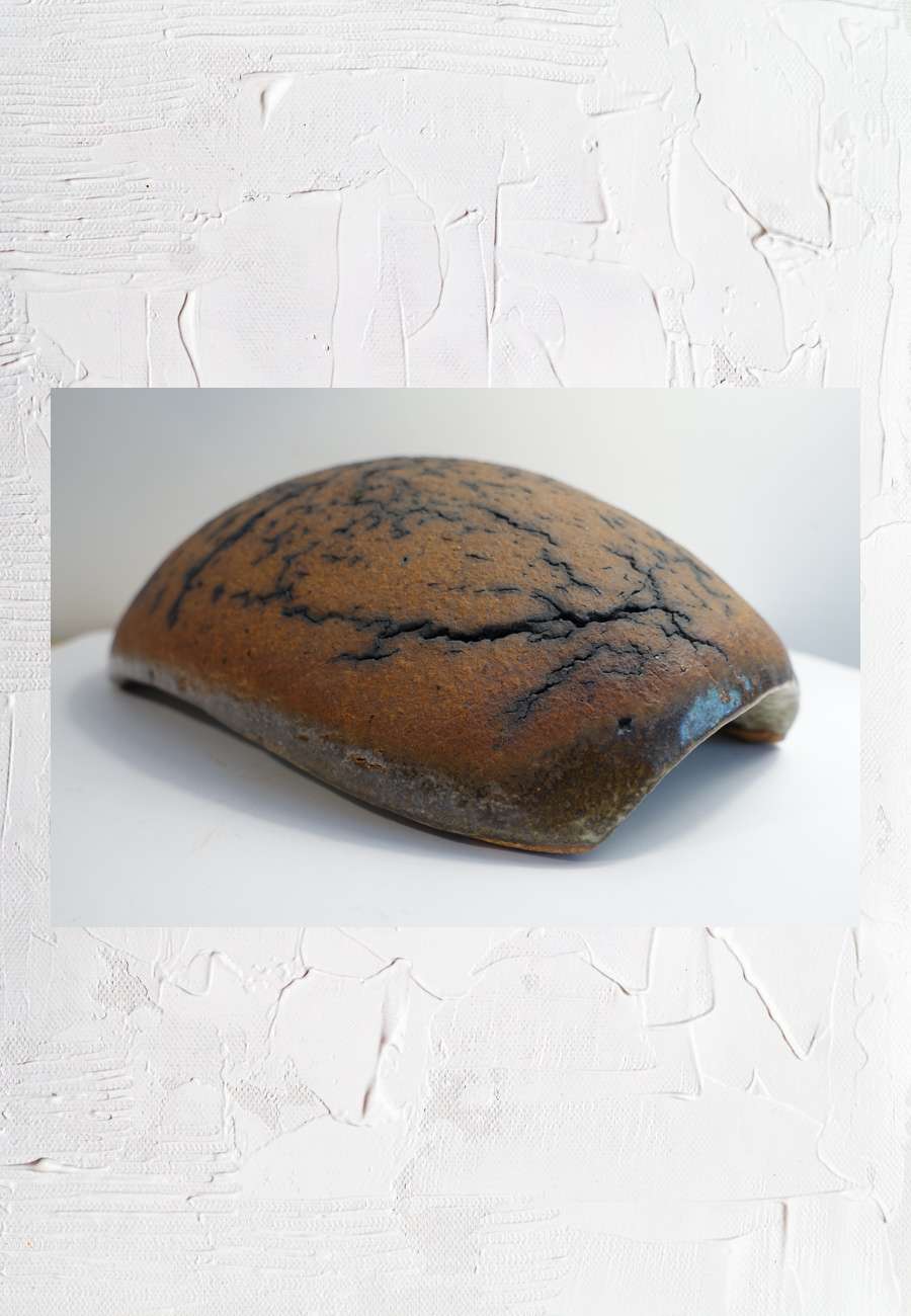Dieser Schildkrötenpanzer (Unikat) zeichnet sich - wie viele seiner Arbeiten - durch die interessante Oberflächenstruktur aus, Größe 33 cm. Der Künstler ist Keramiker (Meisterkurs, Landshut), mit Studienreisen durch Japan, dabei längst näher an der freien Plastik (u.a. beachtliche Bronzen, beispielsweise das