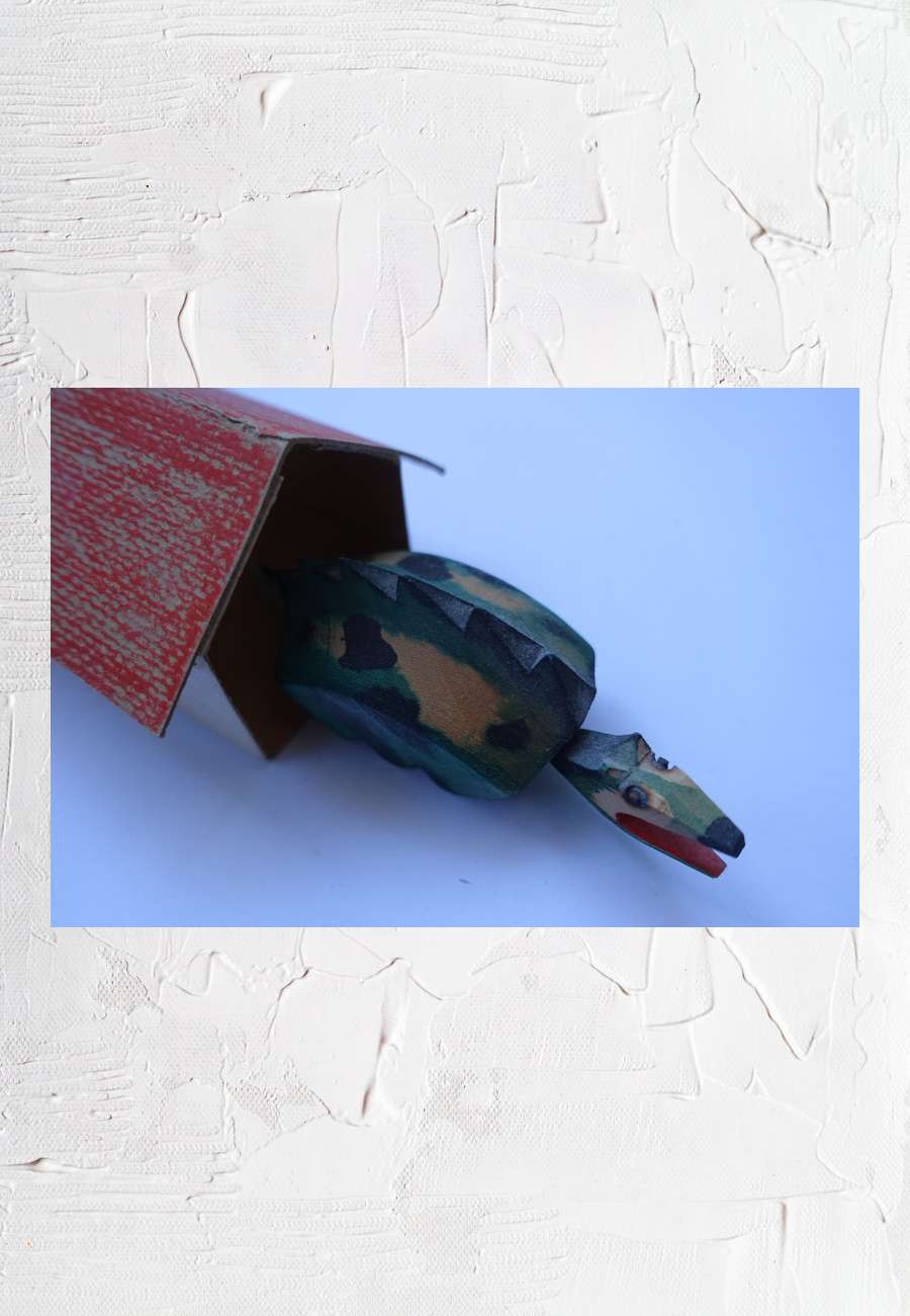 Wer kommt denn da aus der Hundehütte? Das Tierchen ist geschnitzt und bemalt, Kopf und Schwanz sind beweglich eingehängt, Größe ca. 10 cm.