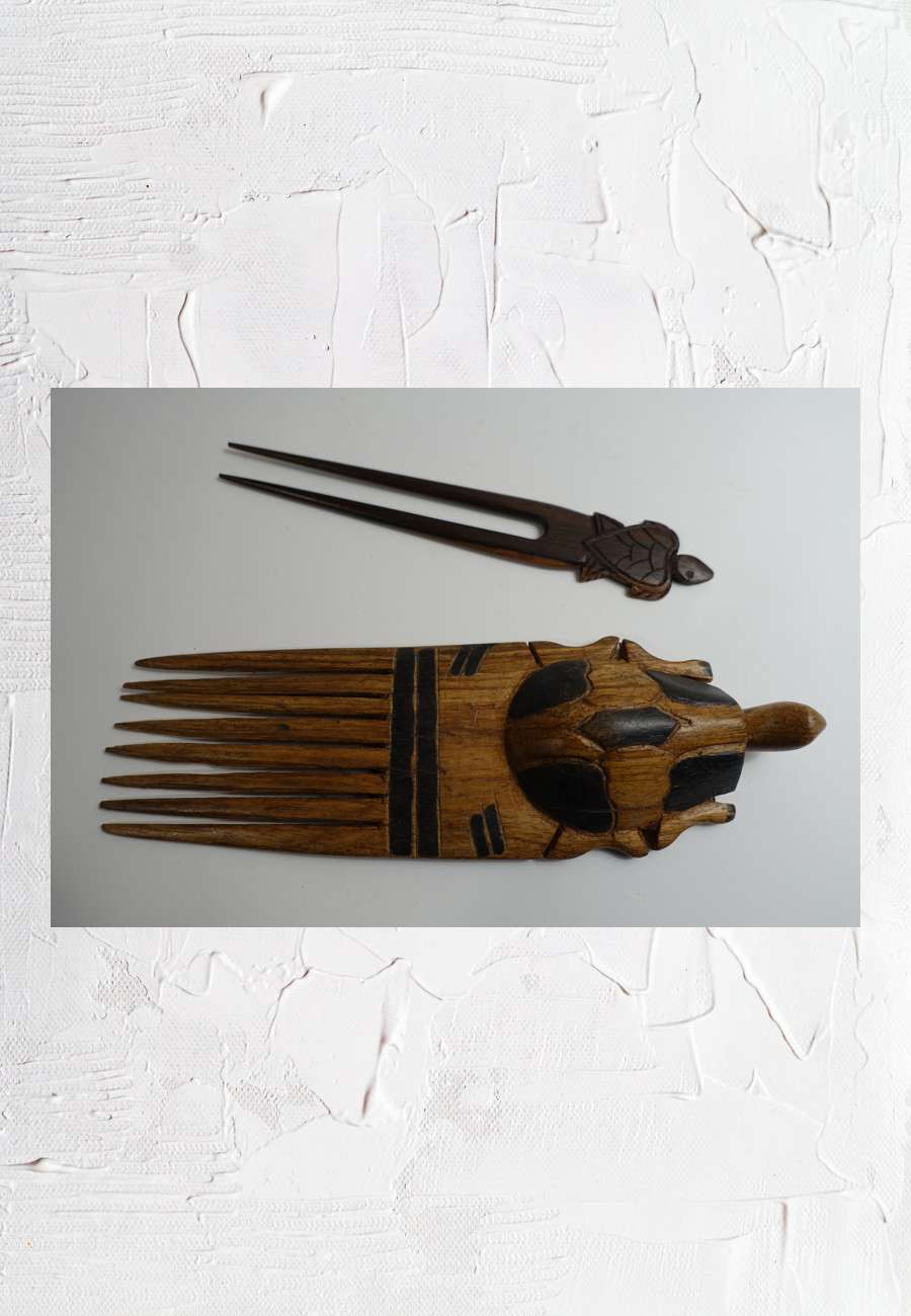 Kamm und Spange für einen Haarknoten, handgeschnitzt in Afrika, Größe 18 und 22 cm.