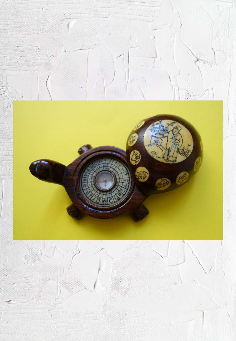 Dreht man den Deckel mit Holzintarsien der chinesischen Tierkreiszeichen, wird ein Kompass mit Magnetnadel sichtbar, Größe 8 cm.