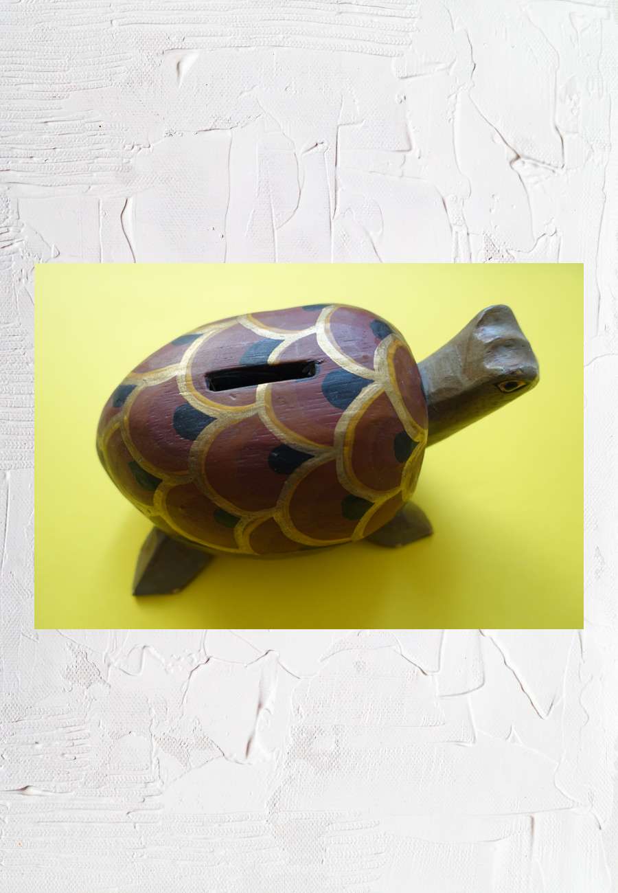 Spardose, ausgehöhlt und bemalt, mit Schieber im Boden zu öffnen, Größe 17 cm. Mit Münzen gefüllt dient sie auch als Rassel.