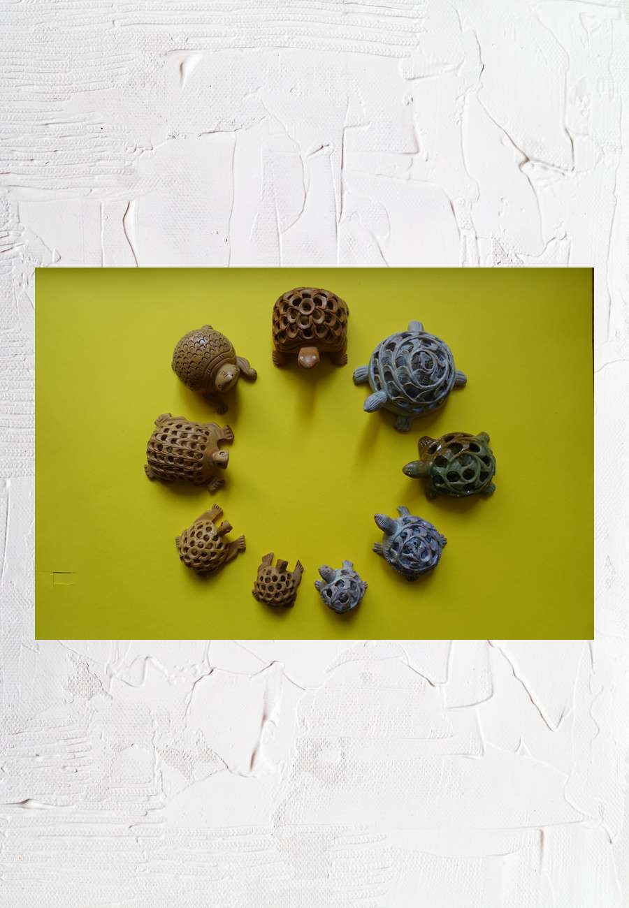 Die Objekte aus Holz, Naturstein und Onyx sind so geschickt durchbrochen, dass im Inneren eine weitere Schildkröte herausgearbeitet werden konnte.