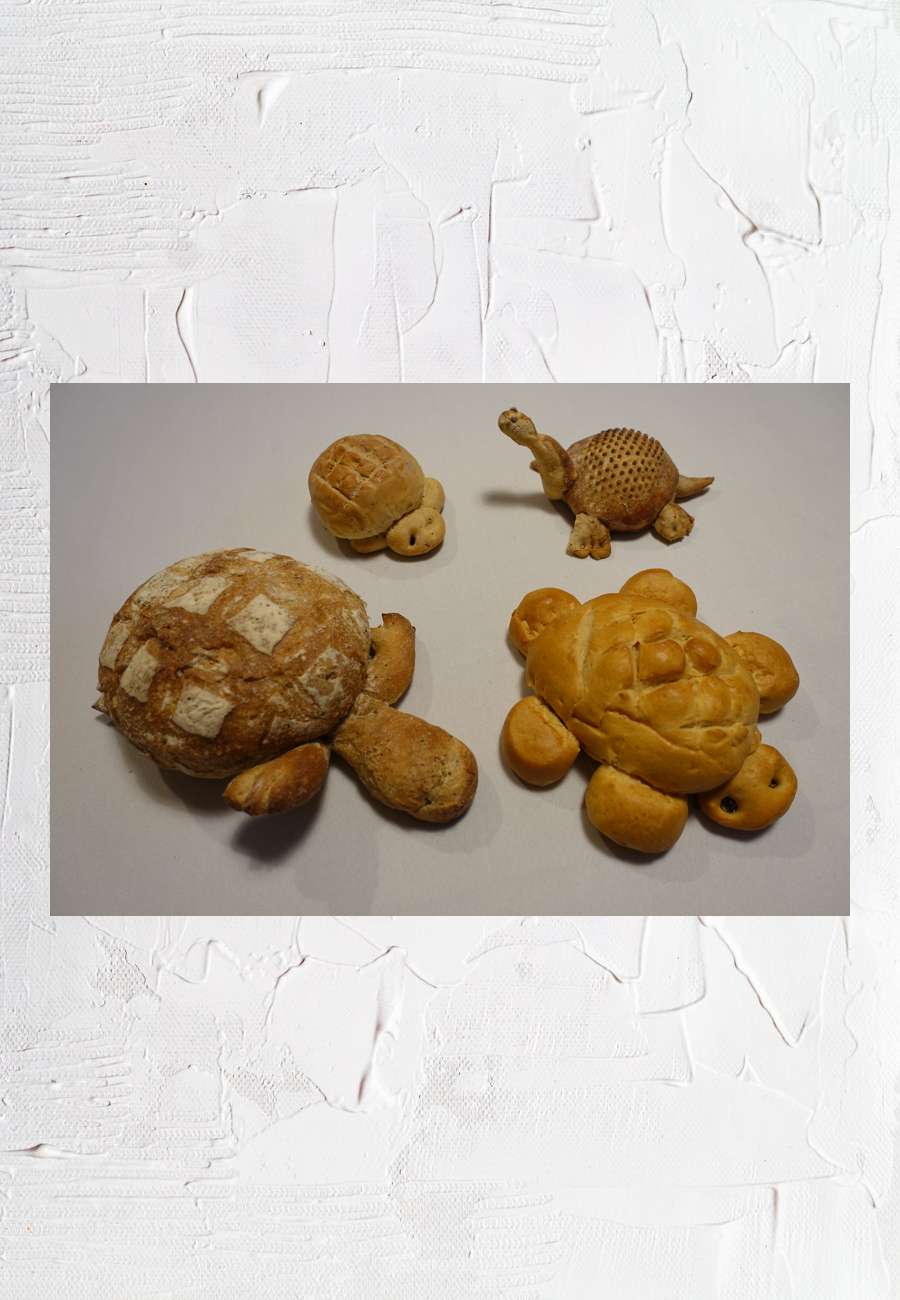 eine gebackene Schildkröte mit. Im Brotmuseum in Ulm ist eine entsprechende Backform zu sehen. In meiner Sammlung sind Förmchen zum Ausstechen von Plätzchen und eine Schildkröten-Backform aus Kupfer zu finden.
