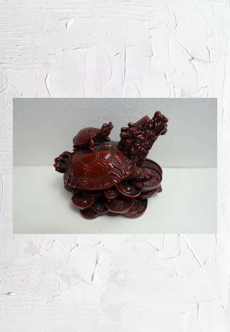 Die Schildkröte mit Drachenkopf (Bixi) hockt auf einem Münzschatz, ein beliebtes Symbol für Reichtum in China, roter Lack, Größe ca. 9 cm. Dem Gott des Reichtums, genannt Lu, werden zuweilen heute noch Opfer gebracht. Es gibt außerdem ein Gegenstück aus grauem Kunststoff, in sehr ähnlicher Form und Größe. Dort sitzt allerdings ein lächelnder Buddha auf dem Panzer.