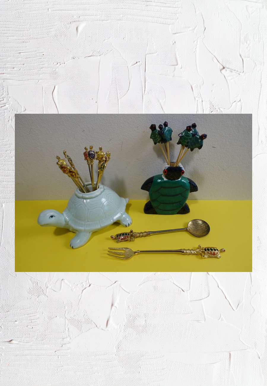 Ess-Spießchen aus Metall und Holz, samt Löffel und Gabel.
