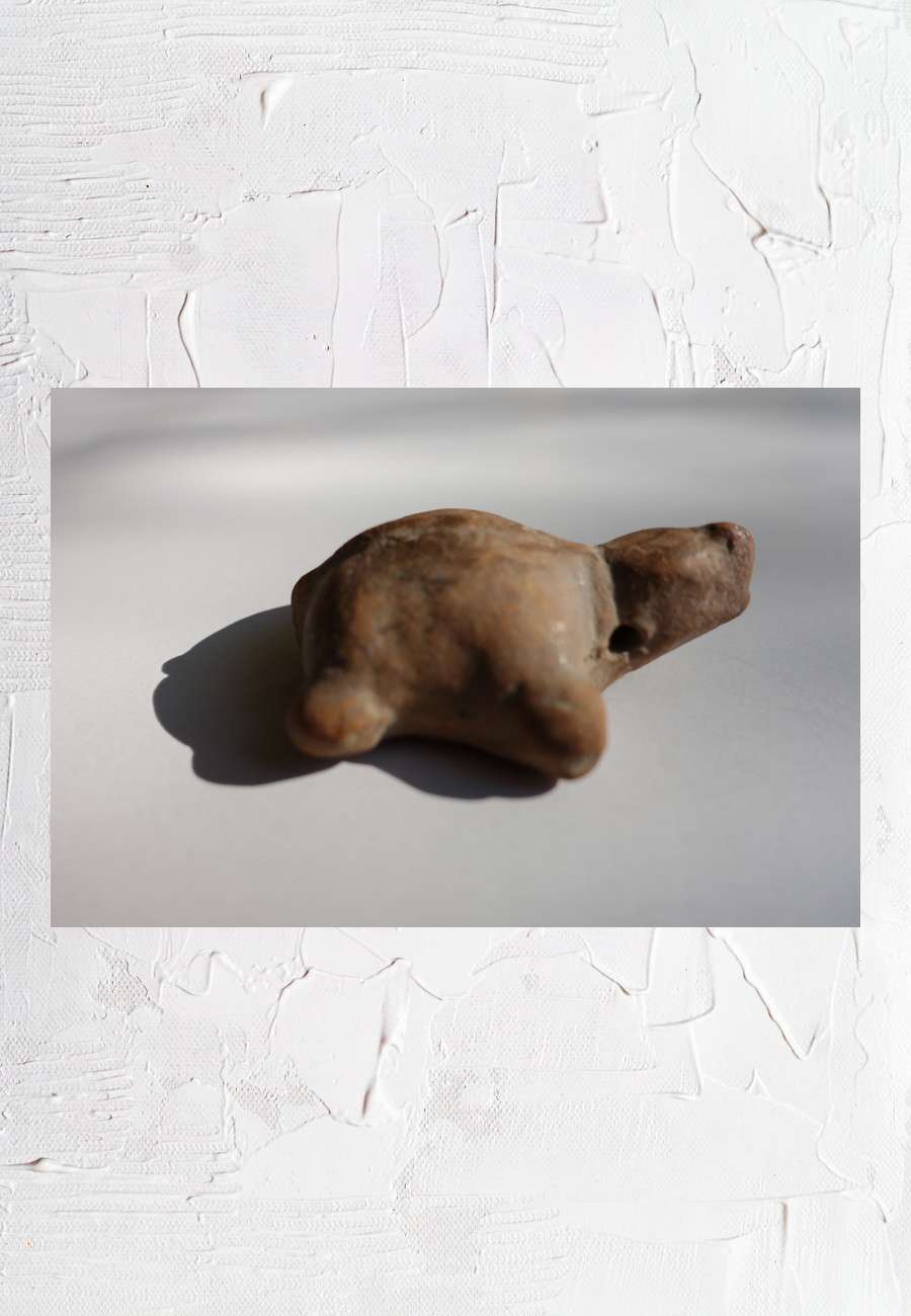 Amulett, Ton, durchbohrt, damit es aufgefädelt um den Hals getragen werden konnte, aus Bamiyan (heute Afghanistan), baktrisch, zweites Jahrtausend vor Chr., Größe 4,5 cm. Das Objekt stammt aus der ehemaligen Sammlung von