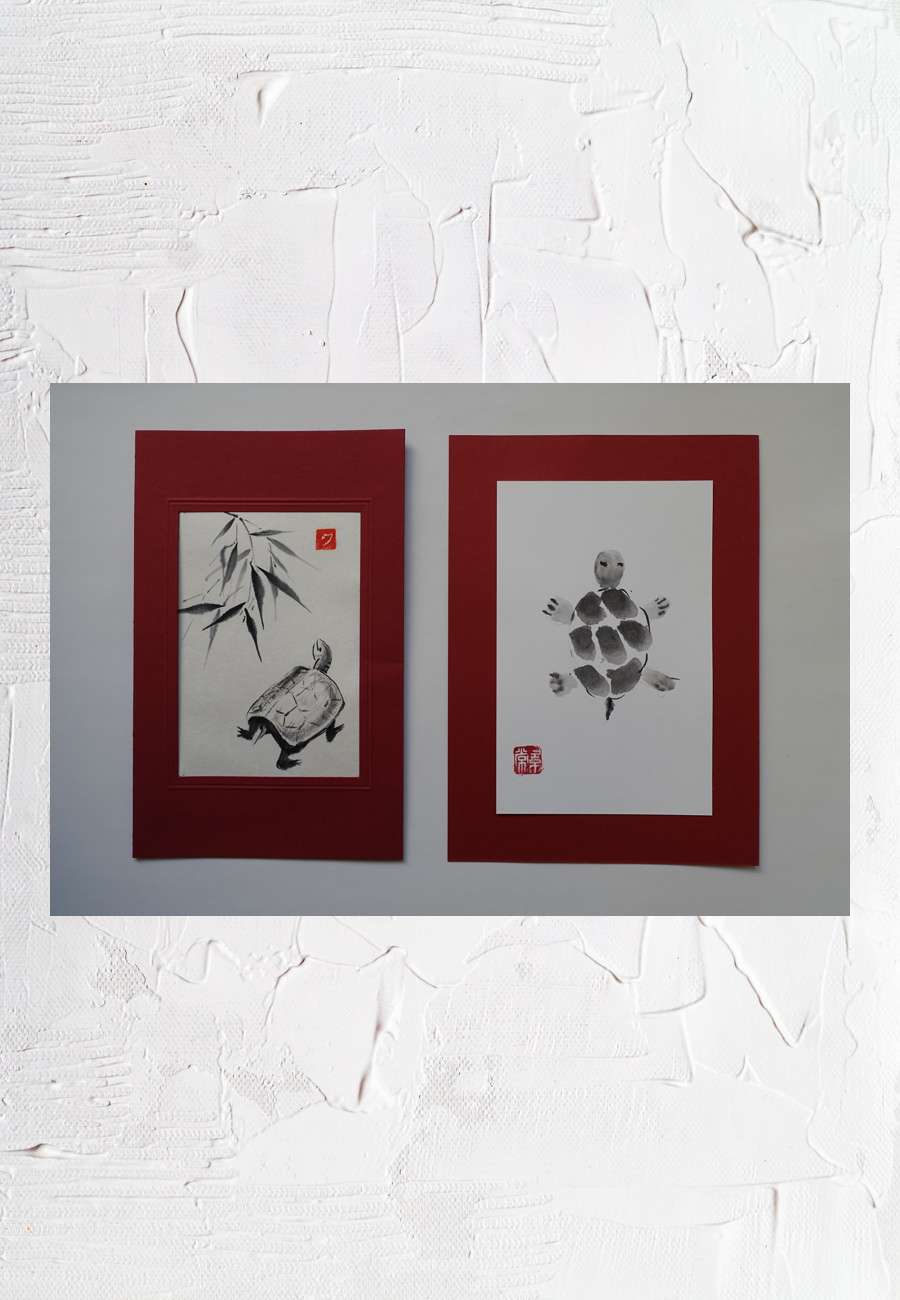 Tusche, in japanischem Stil zart aufgetragen (Unikate), je ca. 12 x 18 cm, links von Claudia Ibler, München, rechts kleine Auftragsarbeit an Jing-Tang Wu, chinesischer