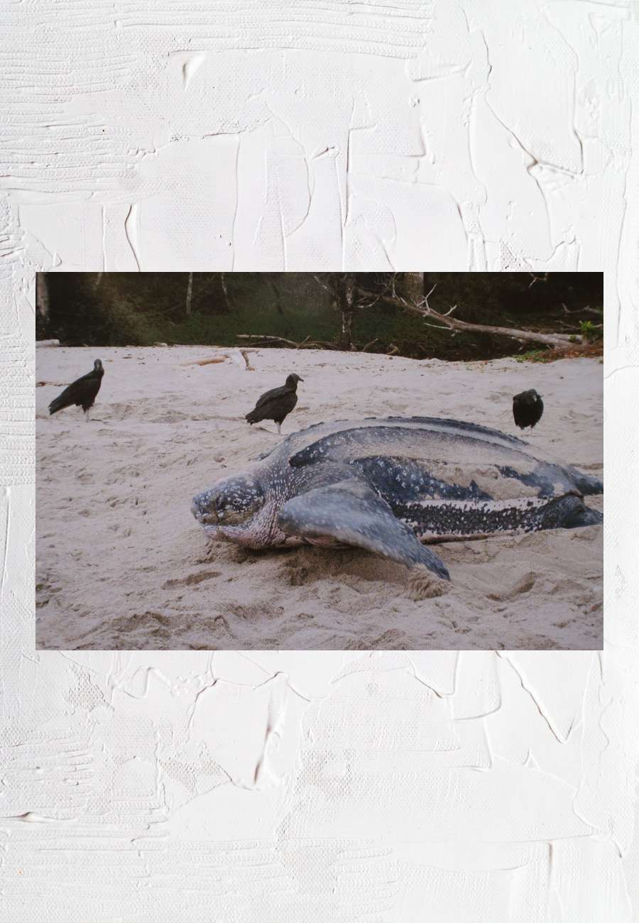 Stranderlebnis mit einer Lederschildkröte, die Rabengeier im Hintergrund spechten auf Schildkröteneier, Format 21 x 15 cm.