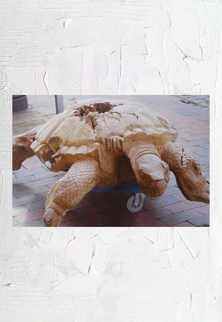 Große Baumwurzel-Skulptur in Leer, Format 20 x 15 cm. Die Aussparungen im Panzer sind Symbol für Verletzlichkeit.