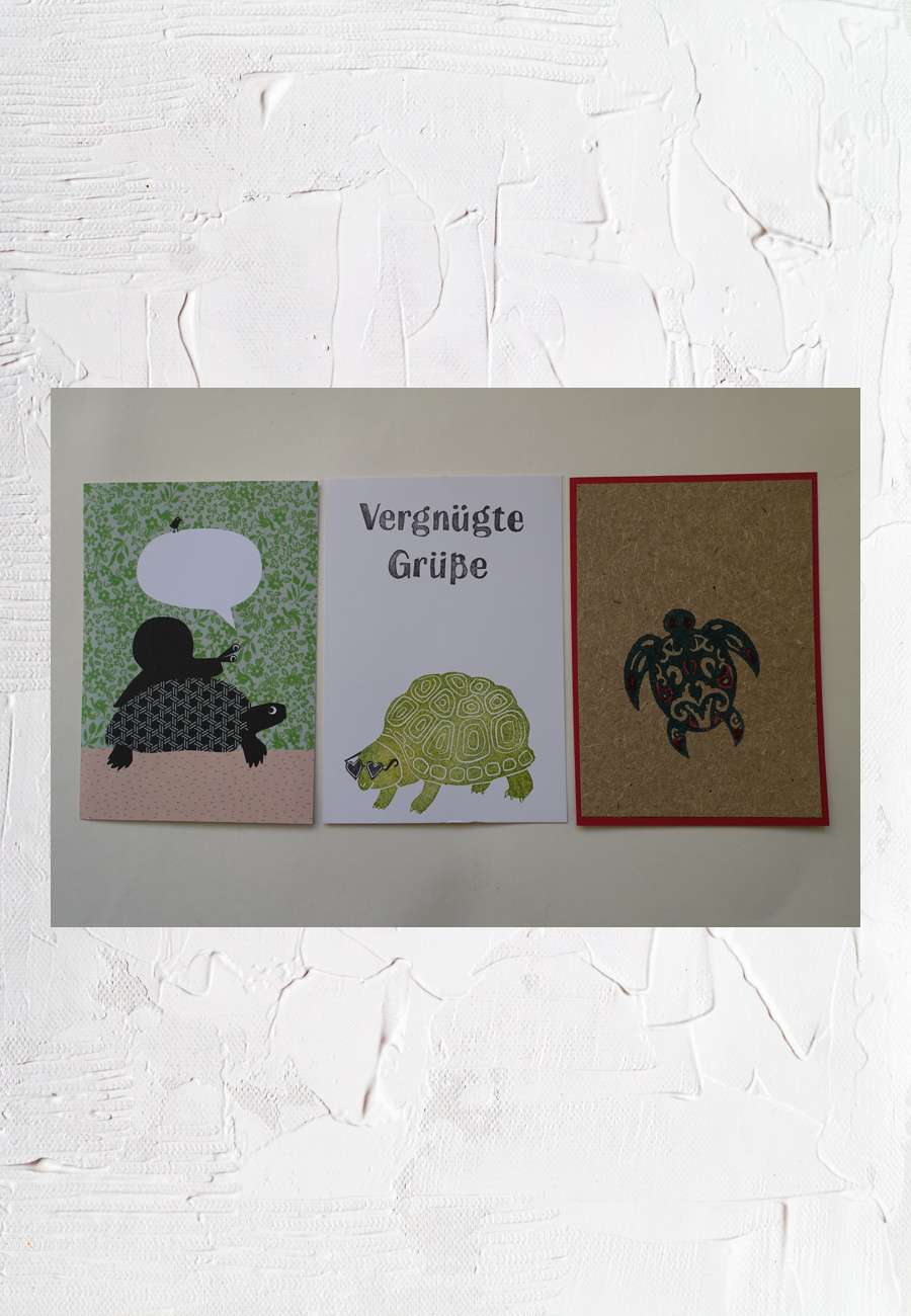 Handgefertigte Karten, Format DIN A 6, von links: frei zu füllende Sprechblase von Karolin Kornelsen, Vergnügte Grüße von C. Reese und Abdruck meines Holzstempels (aus Indonesien, für Batikdrucke gedacht) von