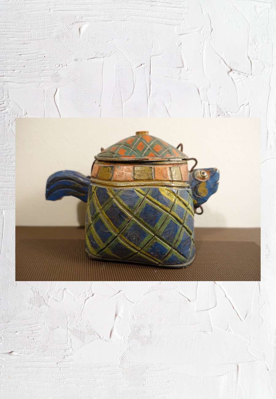 Kannenartiges Gefäß, geschnitzt und bemalt, Größe 24 cm.