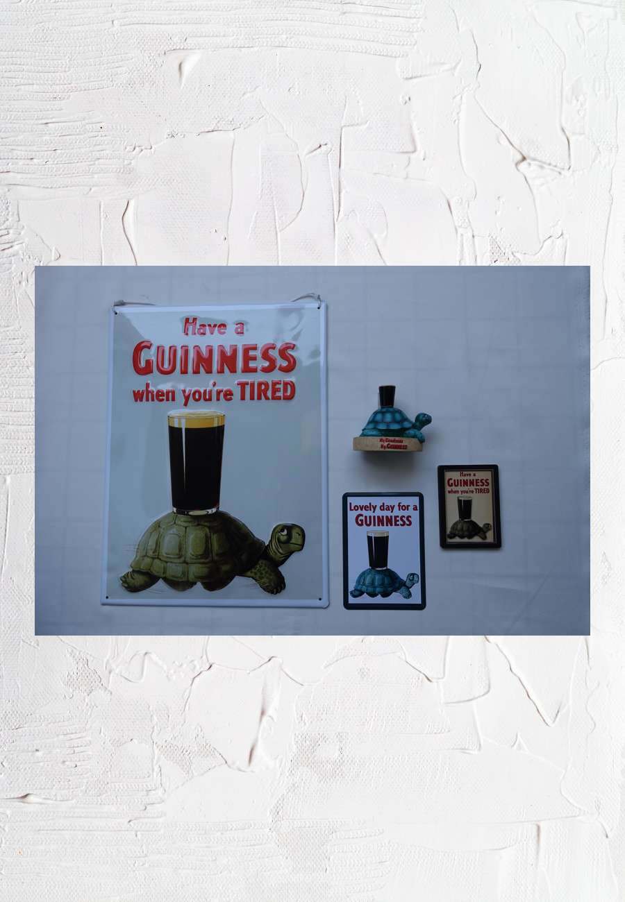 Werbeschilder für Guinness-Bier, aus Blech und Kunststoff, Design von 1936, Maße des großen Schildes 39 x 29 cm. Die plastische Form kommt aus China.
