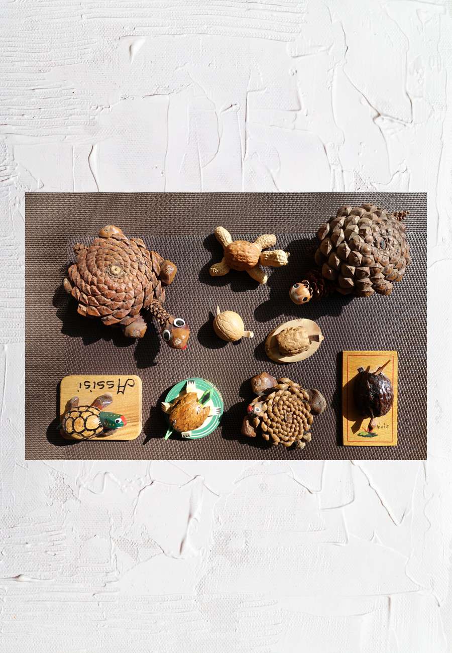 Diese Objekte sind aus Walnuss-Hälften bzw. aus Hasel- und Erdnüssen sowie Kiefernzapfen zusammengesetzt und kommen u.a. aus Italien,Ungarn, Deutschland und Indien (unten, zweites Exemplar von links).