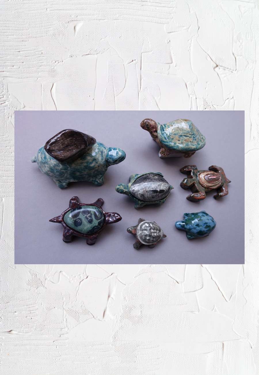 Selbstgetöpfert und glasiert, z.T. mit Panzern aus verschiedenen Materialien, sign.