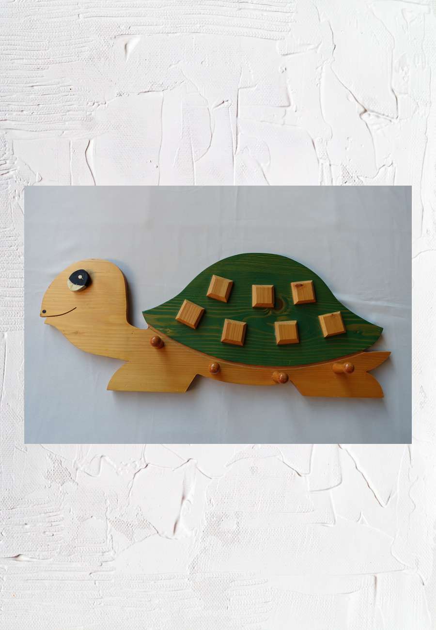 Kindergarderobe, massives Holz, naturbelassen, Auge und Panzer bemalt, Größe 60 cm.