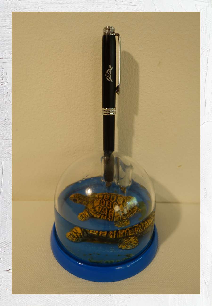 Plexiglaskugel mit schwimmender Schildkröte und einer Halterung für Stifte, Durchmesser 9 cm. Der elegante Kugelschreiber stammt aus dem Hotel "Tortue", Hamburg. Die Schildkröte ist deren durchgängiges Logo.