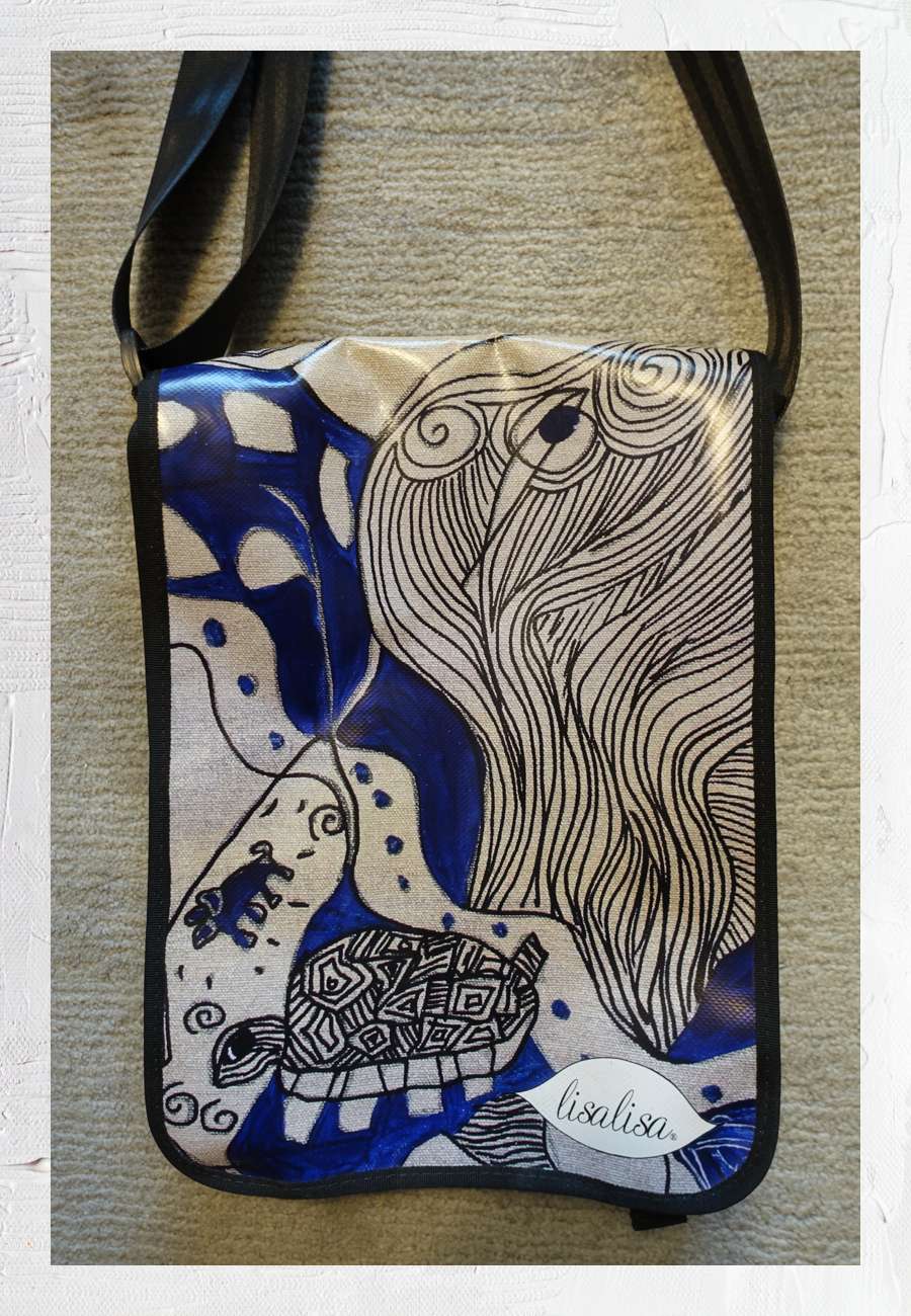 Umhänge-Tasche mit mehreren Innenfächern, aus recyceltem Kunststoff, Größe 40 x 28 x 11 cm.