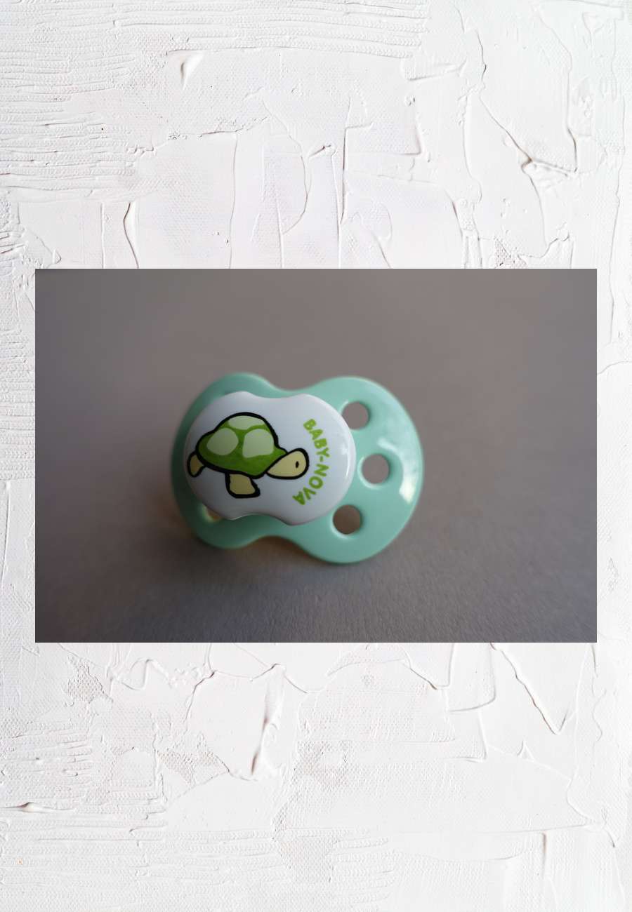 Schnuller, Weichgummi mit Plastikabdeckung, 5,2 cm breit.