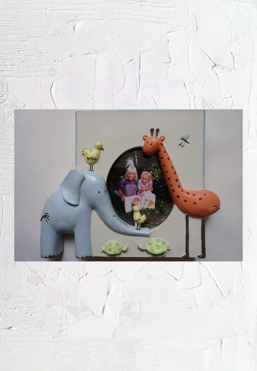 Bemalter Bilderrahmen (mit einem Foto meiner Töchter von 1986), made in China, Größe 16,5 x 19 cm.
