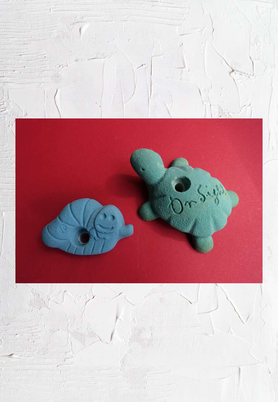 Handgriffe (Beton) für eine Kletterwand, aufgeraut und eingefärbt, Größe 12 und 15 cm.