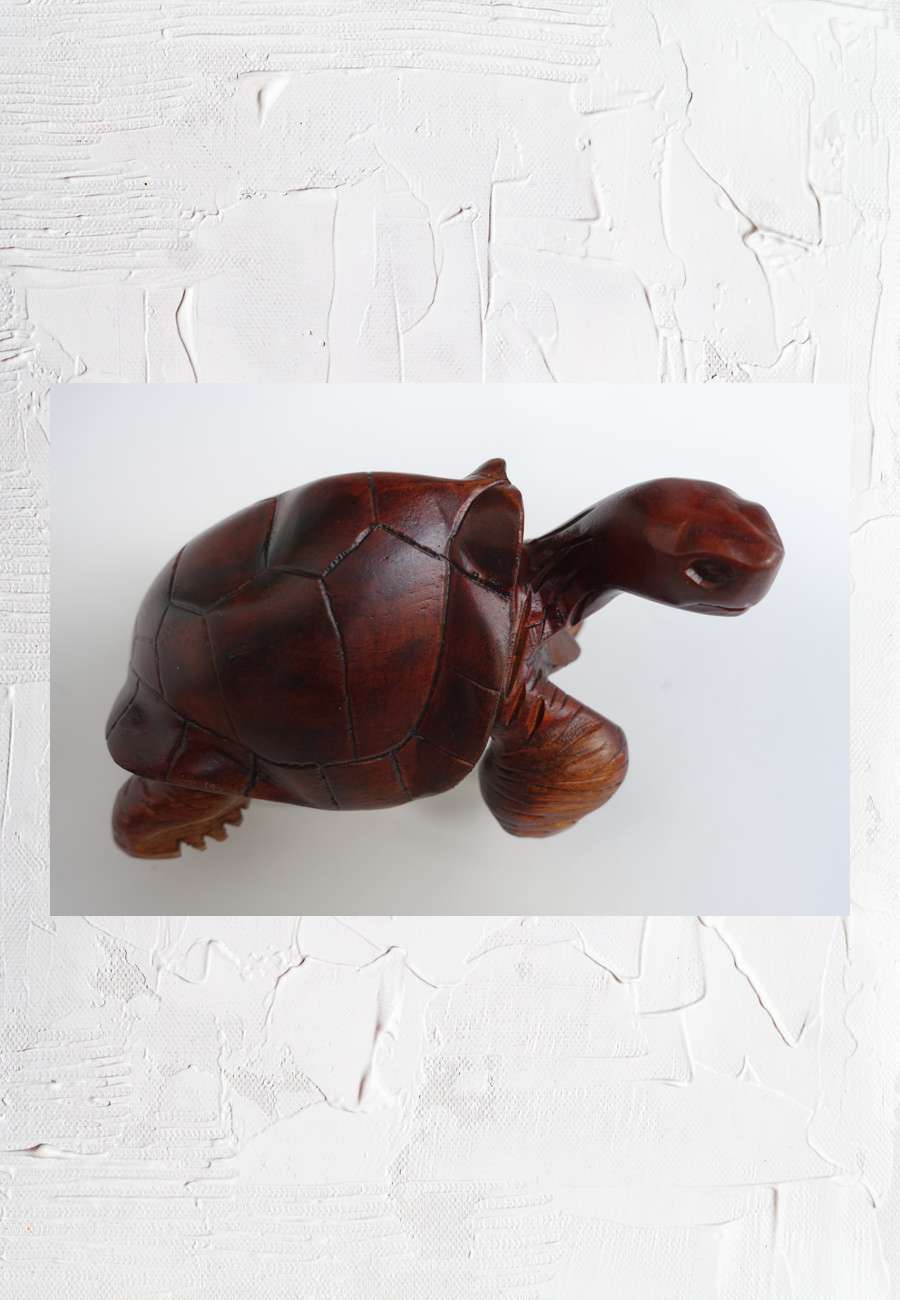 Motiv ist eine Riesenschildkröte, mitgebracht aus Puerto Ayora (Insel Santa Cruz), Tropenholz, handgeschnitzt, Größe 14 cm. Die charakteristischsten Tiere des Archipels sind die bis zu 250 kg schweren Schildkröten, deren Panzerform zum Teil an einen Sattel erinnert. Das spanische Wort für Sattel lautet Galapago - so kamen die Inseln zu ihrem Namen. Am Rand des Städtchens befindet sich die