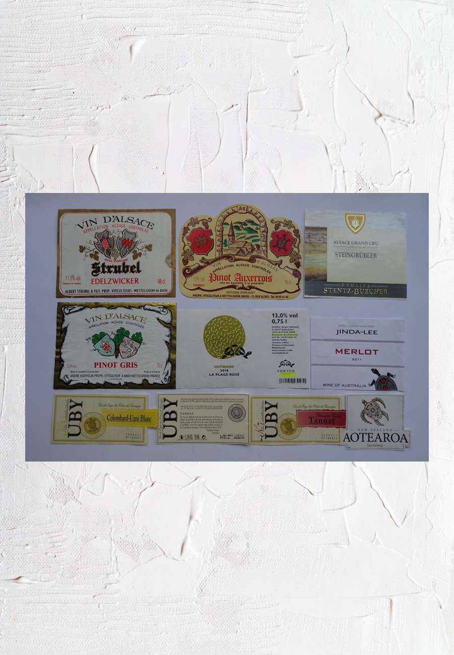 Weinetikette aus Frankreich (Alsace/Elsass), Deutschland (Rheinhessen), Australien und Neuseeland. Weitere Etikette gibt es noch auf vollen und leeren Flaschen.