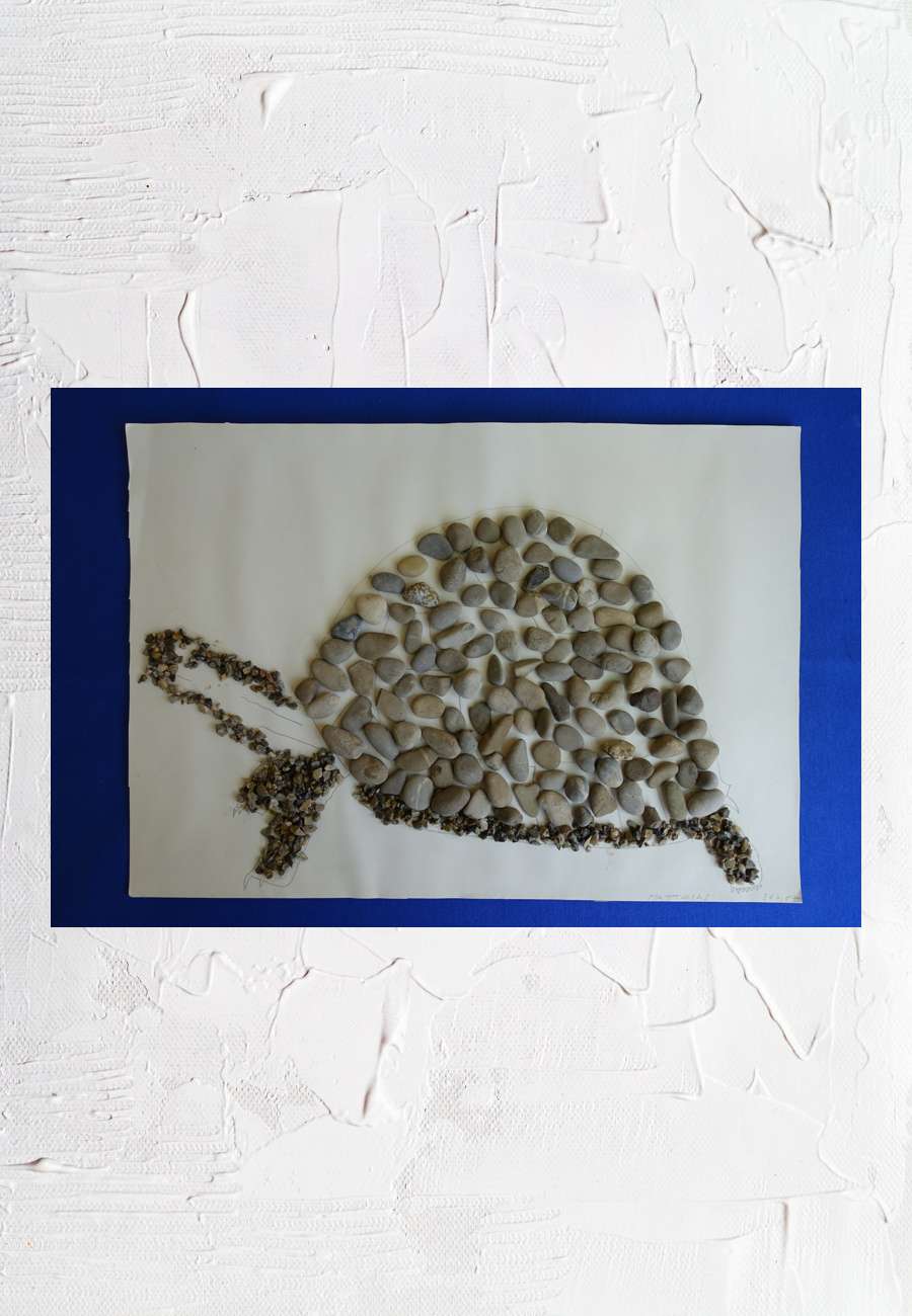 Ein Geschenk aus zahllosen, auf Pappe aufgeklebten Kieselsteinen, Format DIN A 4, Alter 13 Jahre.