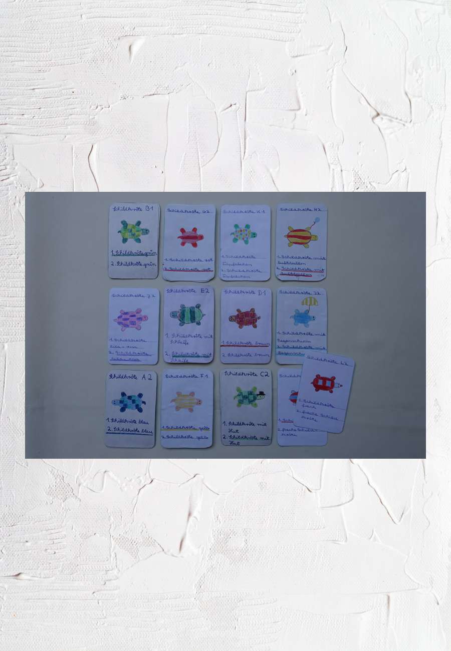 Memory mit 24 Karten, gebastelt und mit Farbstiften variantenreich bemalt, Alter 10 Jahre.