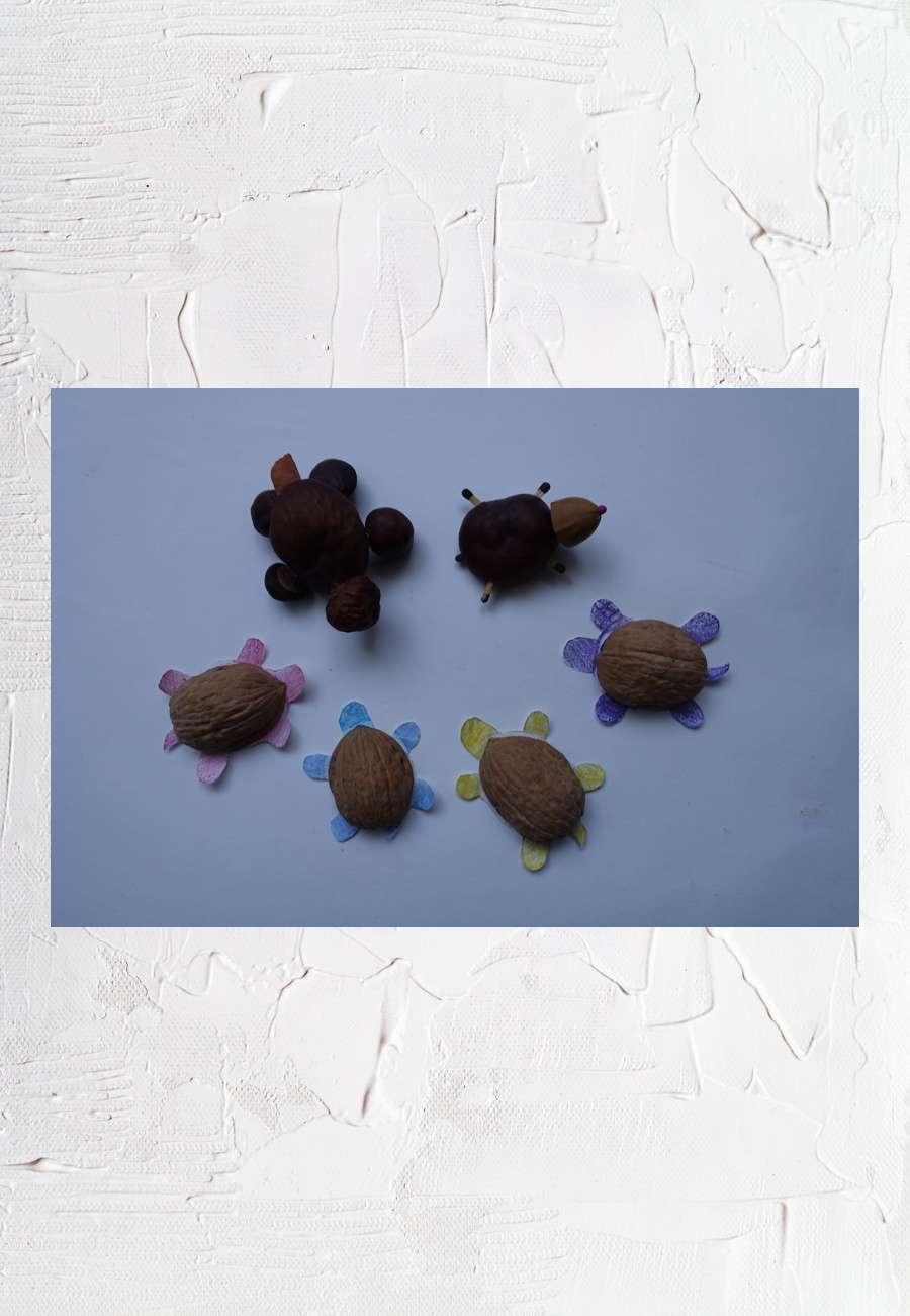 Von Kindern gebastelt, aus Kastanien, Streichhölzern und Walnuss-Hälften, z.T. auf bemaltem Papier.