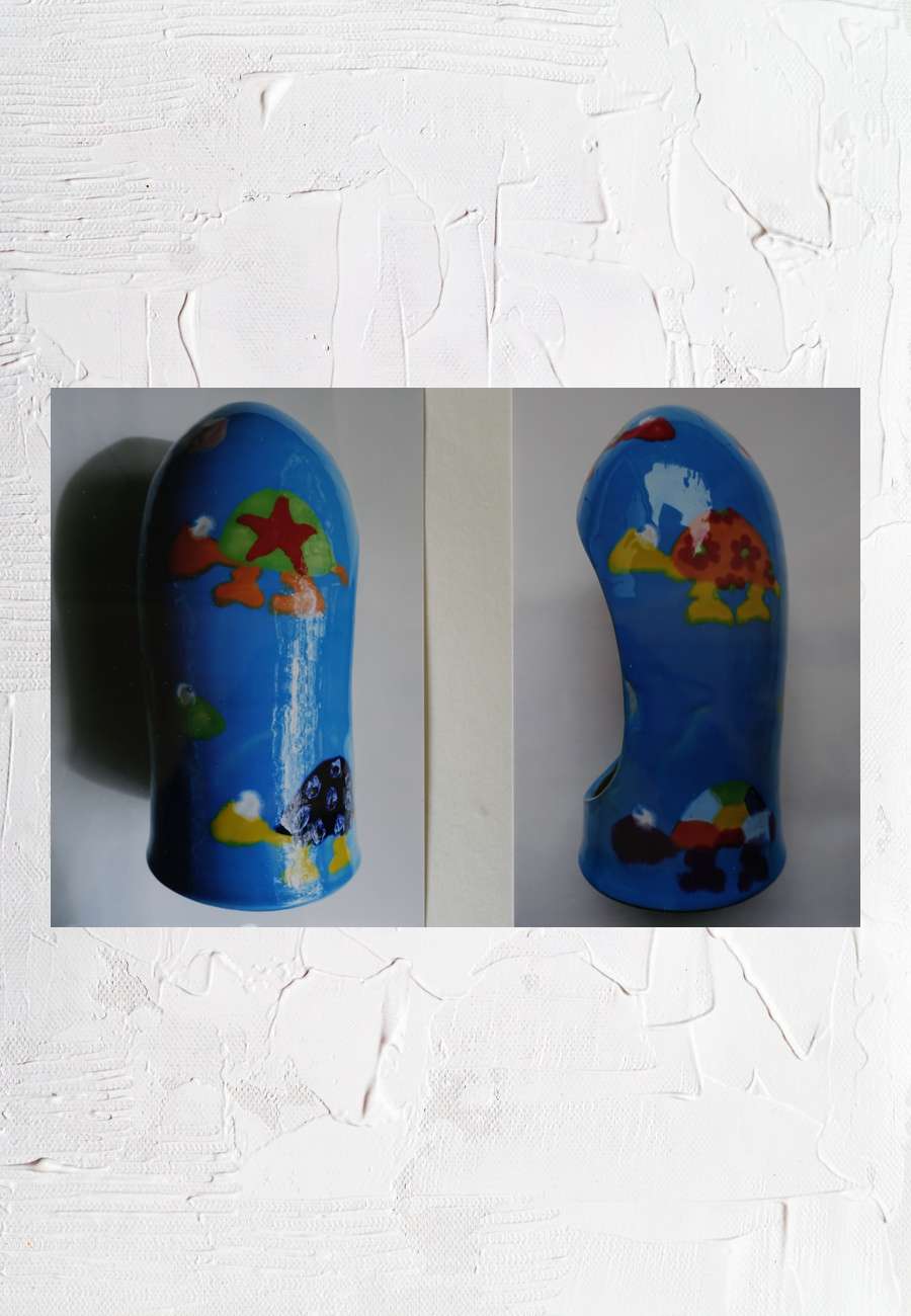 Auftragsarbeit, handgetöpfertes Gefäß für eine WC-Bürste, mit insgesamt 7 Schildkröten farbenfroh bemalt, Größe 24 cm, s. auch weitere Arbeiten der Künstlerin.