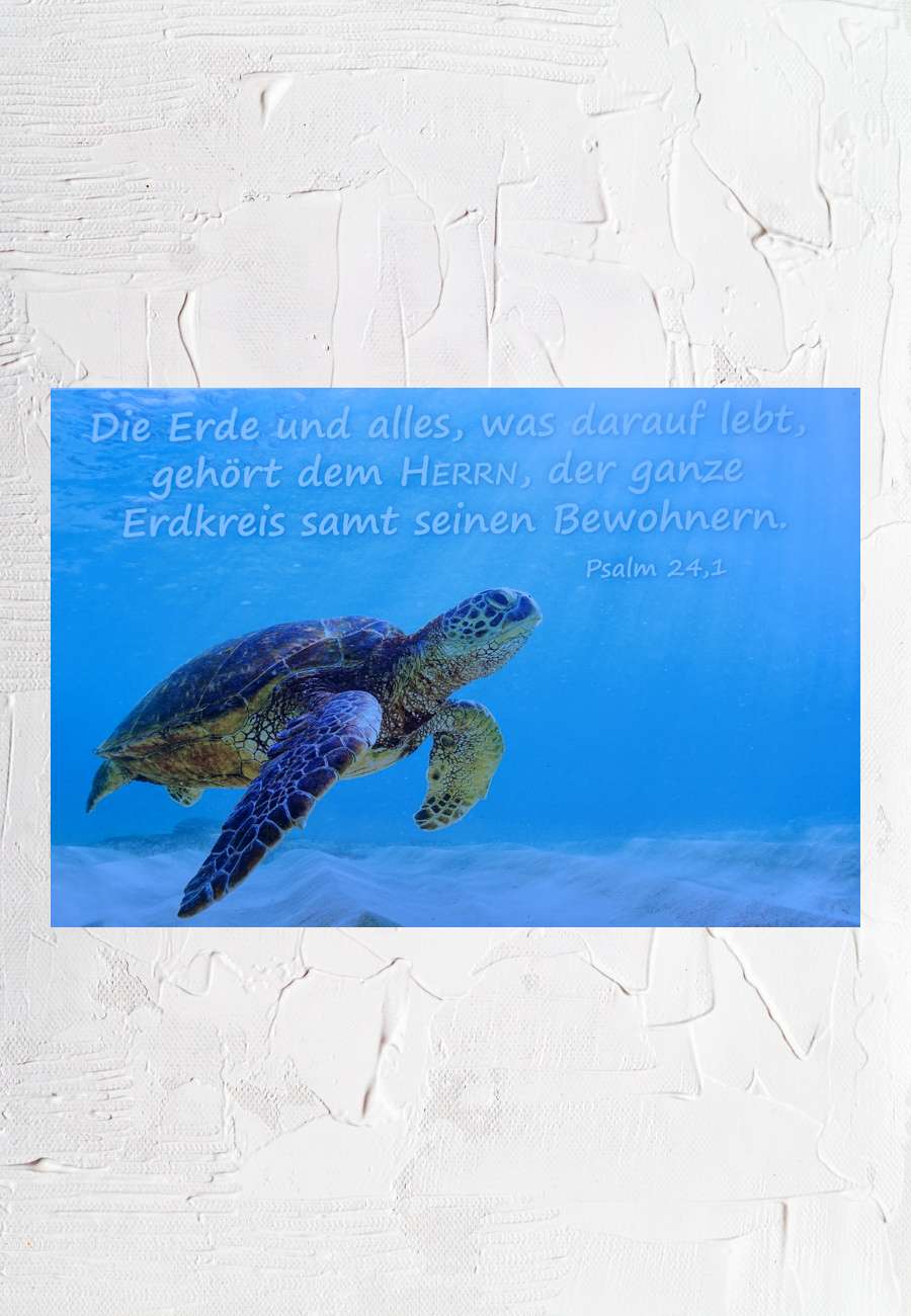 In der Bibel kommt zwar allerhand Getier vor, aber keine Schildkröte. Auf dieser Karte zum Geburtstag wird aber ein Psalm zitiert, dessen nächste Zeile lautet "denn er hat ihn (d.h. den Erdkreis) über den Meeren gegründet..." (Luther-Übersetzung) und daraus ergibt sich die Verbindung zur abgebildeten Meeresschildkröte.