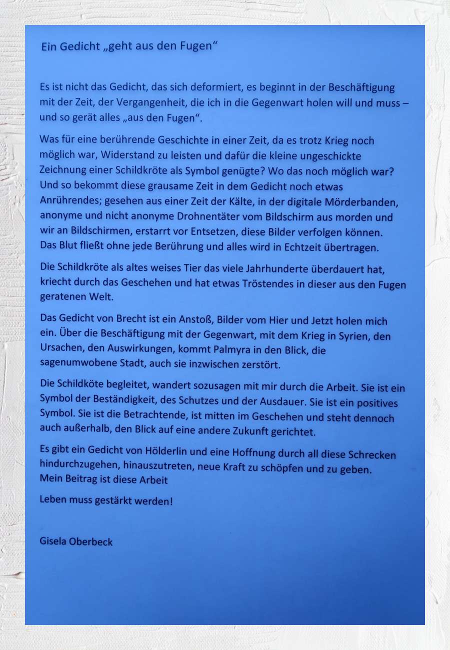 Eigener Text der Künstlerin, siehe Arbeitsmaterialien zum Projekt "Im Zeichen der Schildkröte" nach dem Gedicht von B. Brecht.