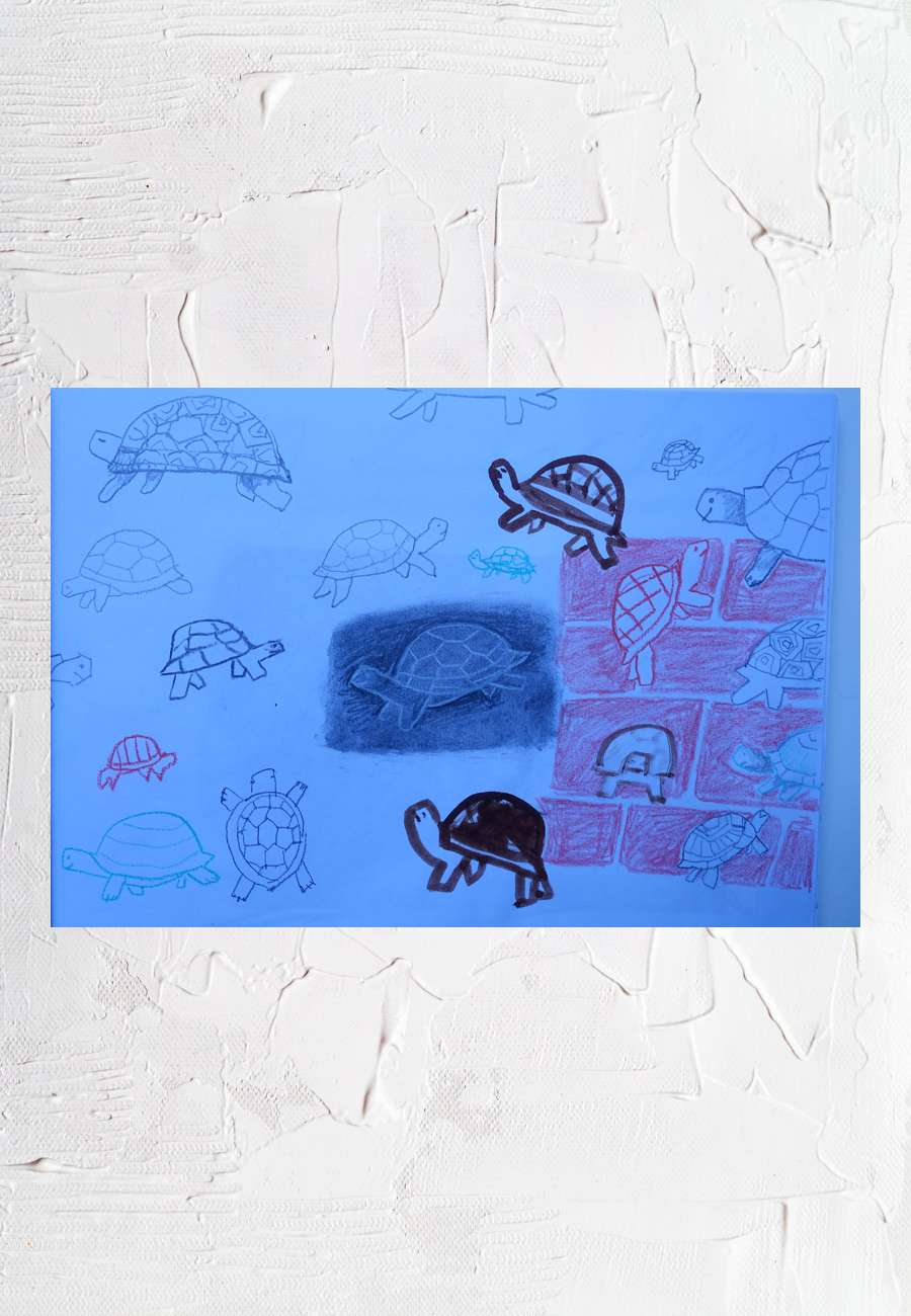 Beispiel zu den Arbeitsmaterialien für das Künstlerbuch "Im Zeichen der Schildkröte", nach dem Gedicht von B. Brecht, Farbskizzen, Format DIN A 4.