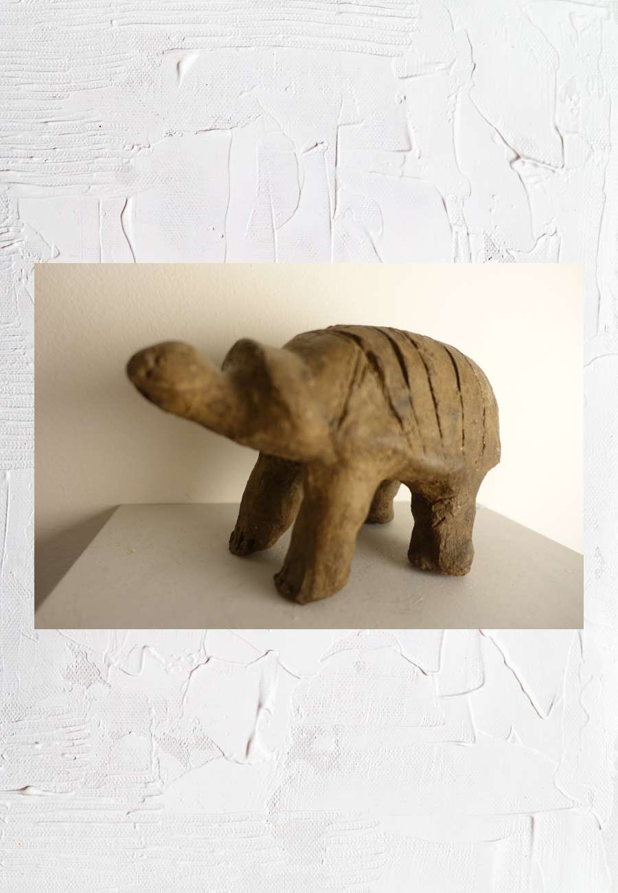 Massive Tonskulptur aus dem Tschad, naturbelassen, Panzermuster eingekerbt, um 1950, Größe ca. 20 cm.
