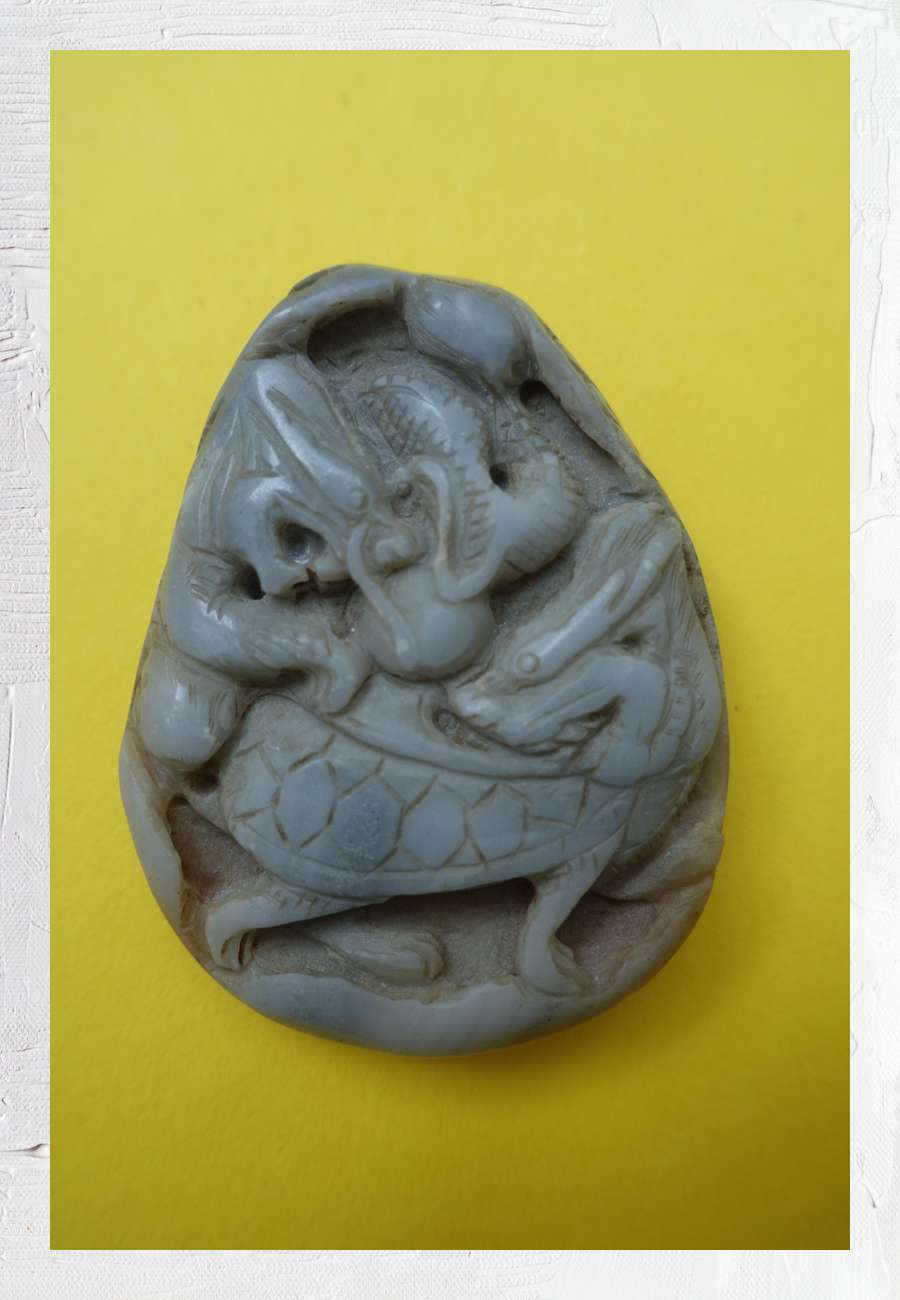 Schmuck-Anhänger aus Jade, Motiv: Fabeltiere und Schildkröte mit drachenähnlichem Kopf, Größe ca. 6 cm.