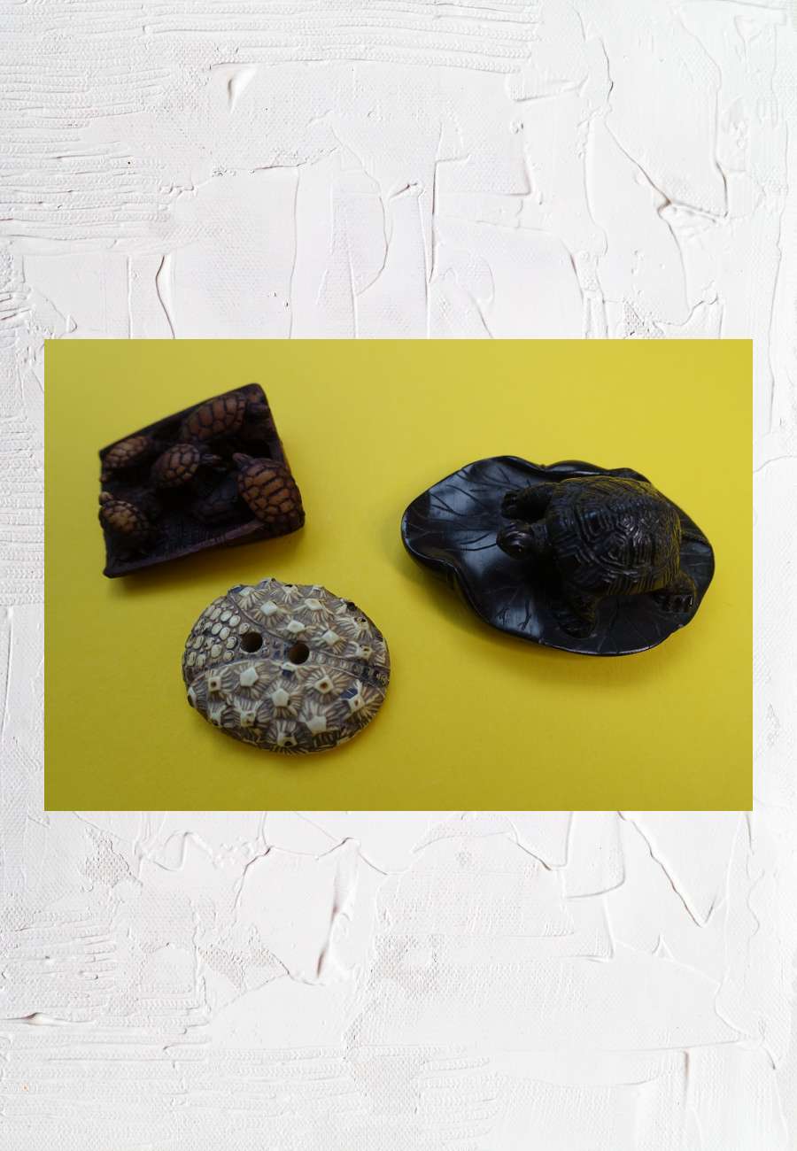 Drei handgeschnitzte Objekte, nach 1900, links: 7 Schildkröten sitzen in einem Korb (Holz), mittig: Zierknopf mit der Struktur einer Sternschildkröte (