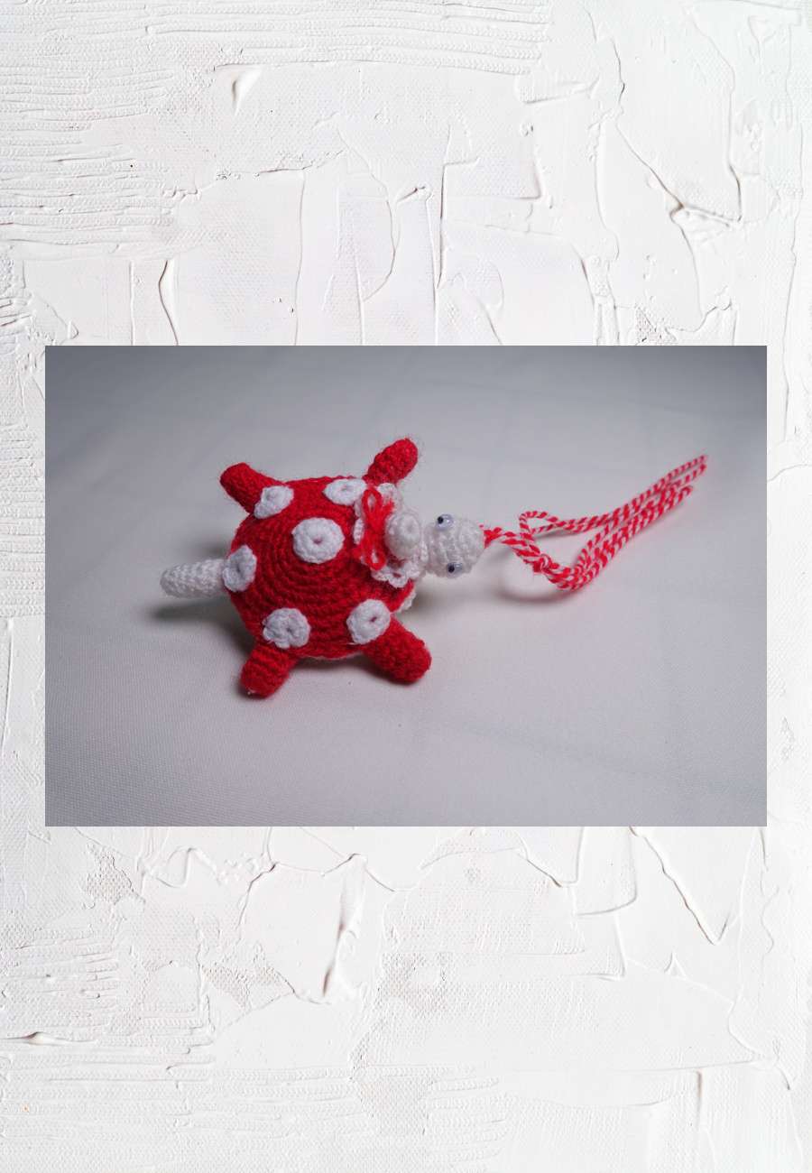 Marteniza, gehäkelt von einer alten bulgarischen Bäuerin, Größe ca. 10 cm (ohne Bändchen). Es ist ein Talisman für Gesundheit und langes Leben, in verschiedenen Formen und Materialien (hier Textilien), aber stets rot und weiß. Die Farben stehen für rote Wangen und weißes Haar (hohes Alter). Es ist zugleich Symbol des kommenden Frühlings. Erwachsene, Kinder und sogar Haustiere werden immer Anfang März mit Martenici beschenkt. Ein uralter Brauch, den nun Reinhild Gerum fortgesetzt hat.