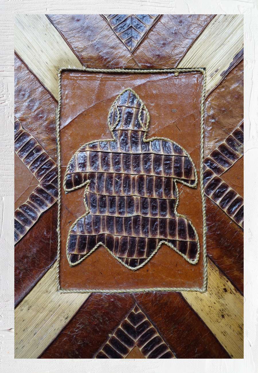 Einband eines Fotoalbums (Ausschnitt), handgemacht aus Holz, Bananenblättern, Palmfasern, Bohnenschoten und Reispapier, Format ca. 25 x 25 cm.