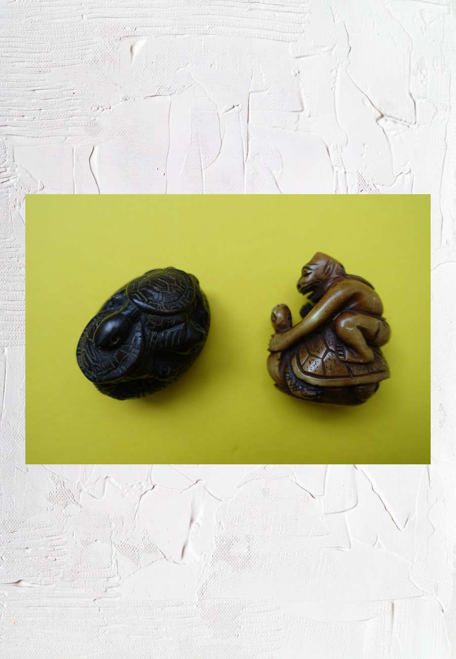 Netsuke um 1900, aus Buchsbaum (sign.) und Elfenbein.