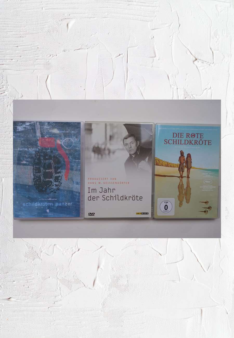 Drei Filme (DVD) mit jeweils ausgefallenem Bezug zum Thema "Schildkröte", Laufzeit (von links) 30 Min., 93 Min. und 77 Min.