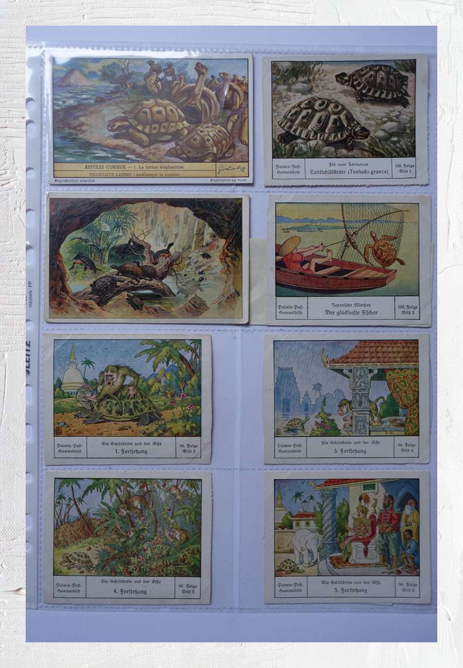 Alte Sammelkarten der Firmen Liebig, Palmin und Pfeiffer & Diller, rückseitig mit Erklärungen, Größe ca. 10 x 7 cm.