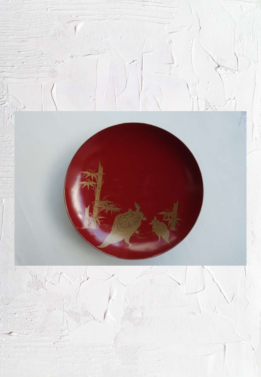 Große Schale, Lack mit Goldmalerei, Motiv Bambus und Minogame, Durchmesser 22 cm.