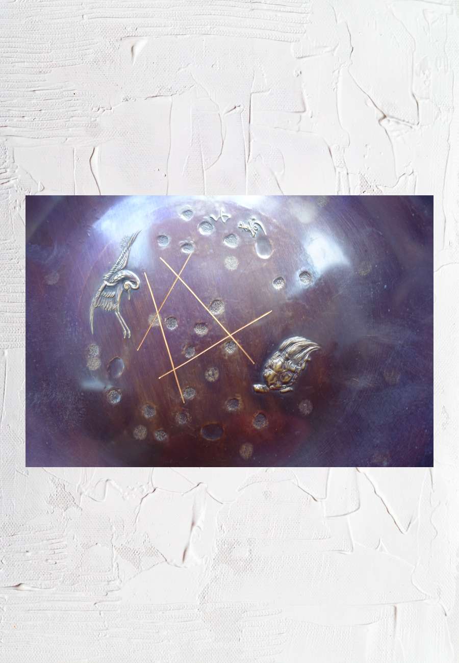 Zeitgenössische Kupferschale (Ausschnitt), geprägt mit den traditionellen Motiven Minogame und Kranich, sign., rückseitig ist eine Inschrift eingraviert, Durchmesser 24 cm.