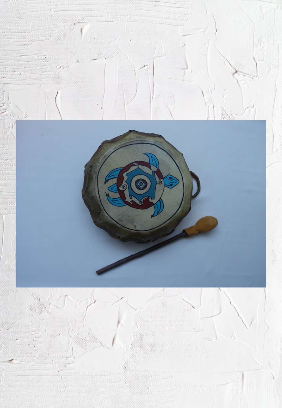 Indianische Trommel, handwerklich solide Volkskunst, Holzrahmen, beidseitig mit Tierhaut sorgfältig bespannt, handbemalt, Durchmesser 25 cm (ohne Handgriff), sign.